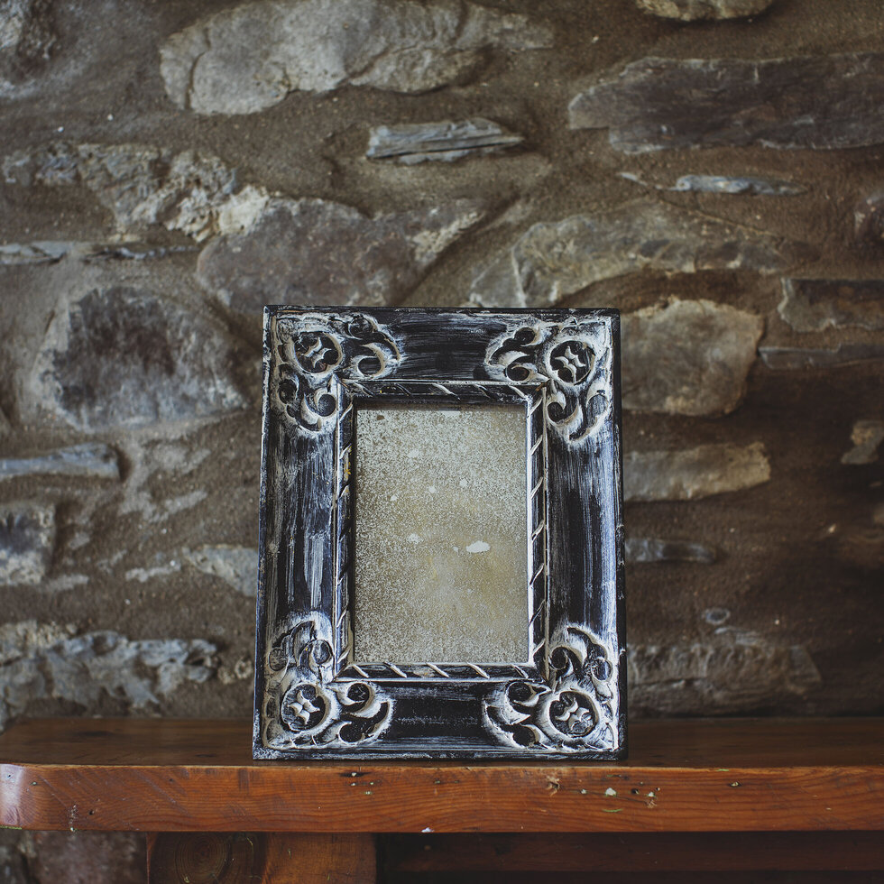 Vintage inspired mirror with a wood frame painted black then whitewashed. Mirror has been antiqued by hand so can vary in how much mirror is remaining. Decorative rather than functional.