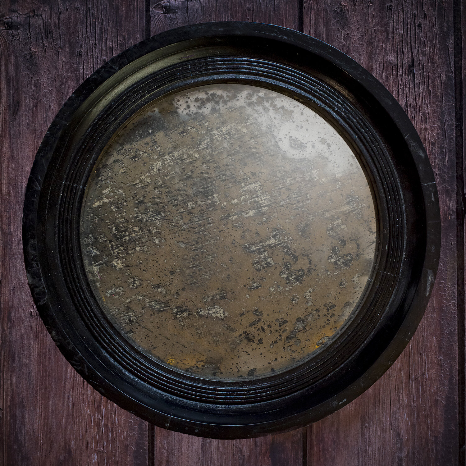 Black painted round mirror with antiqued glass. All hand made. Antiquing on mirror varies.