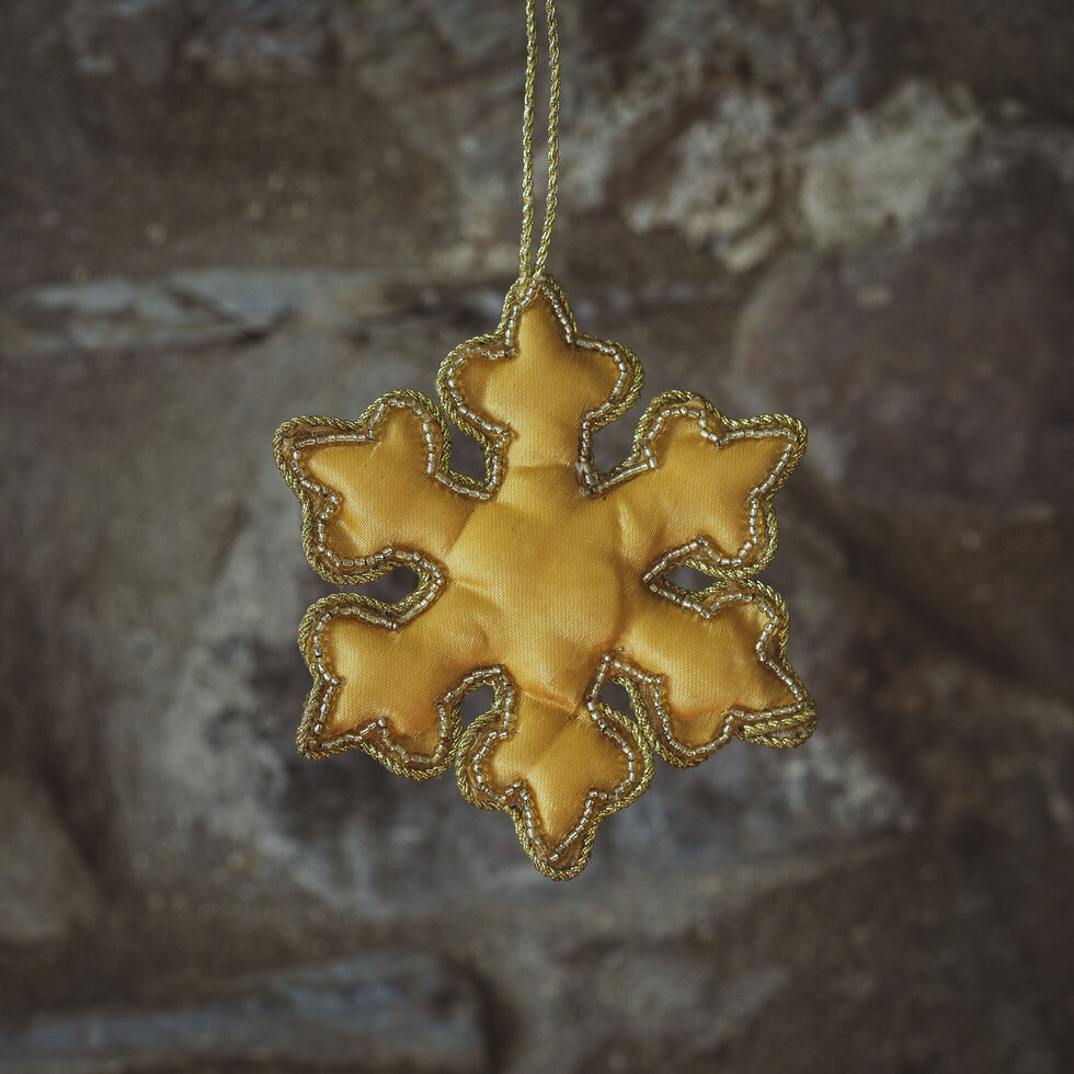 Gold snowflake decoration embroidered with gold thread on one side. Plain satin back.