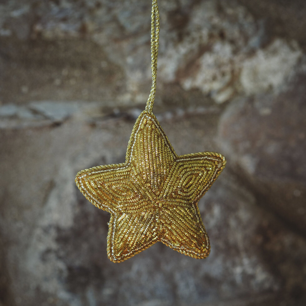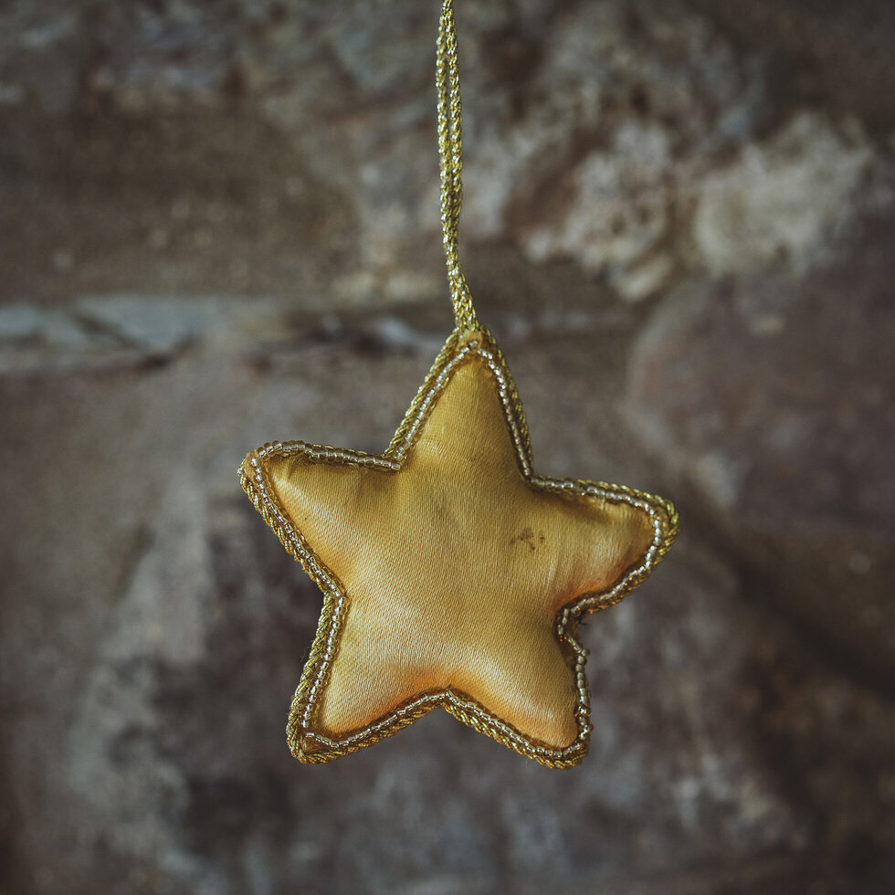 Beautiful little embroidered star decoration. Embroidered with gold coloured thread on one side and plain satin on the reverse.