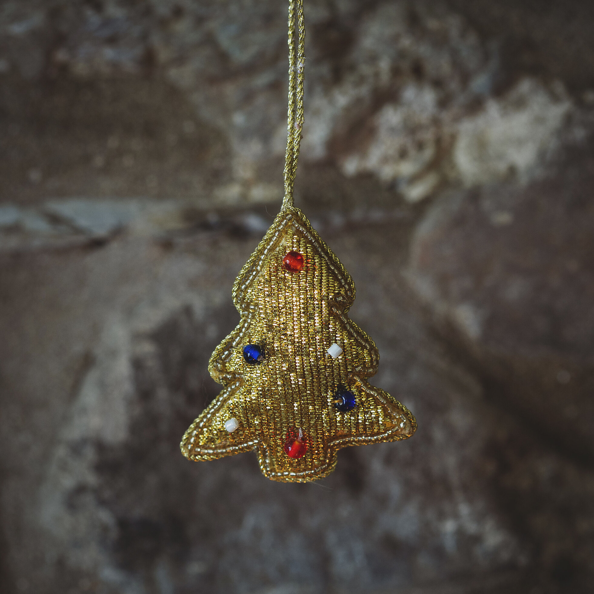 Little Tree Decoration embroidered with gold thread and tiny coloured glass beads. Plain on reverse.